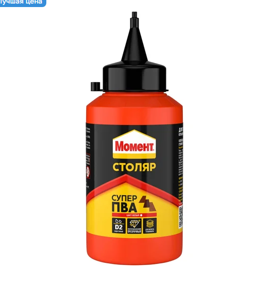 Супер клей ПВА Момент имеет белый цвет, который хорошо сочетается со светлыми породами дерева. Подходит для склеивания ДСП, фанеры, шпона, ламината, картона, фурнитуры, ткани, кожи, некоторых пластиков, дерева. Клеевой шов получается очень прочный и термостойкий. Широкое применение данный клей нашел при сборке и ремонте мебели. Такой клей необходимо беречь от мороза и хранить с плотно закрытой крышкой при температуре от +5ºС до +30ºС. Срок годности — 24 месяца.