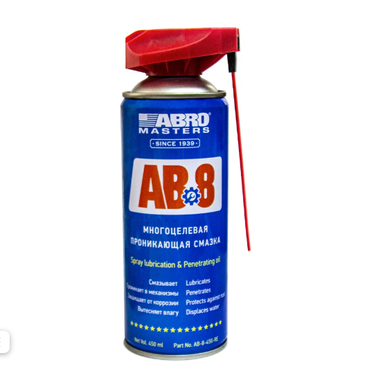 Универсальная смазка — спрей Abro Masters аэрозоль 450 мл AB-8-450-R обладает широким спектром действия. Применяется в ремонте автомобильной, промышленной, морской техники. Помогает освобождать от коррозии болты с гайками и другие резьбовые и шлицевые соединения, глубоко проникая в приржавевшие и заклинившие детали.